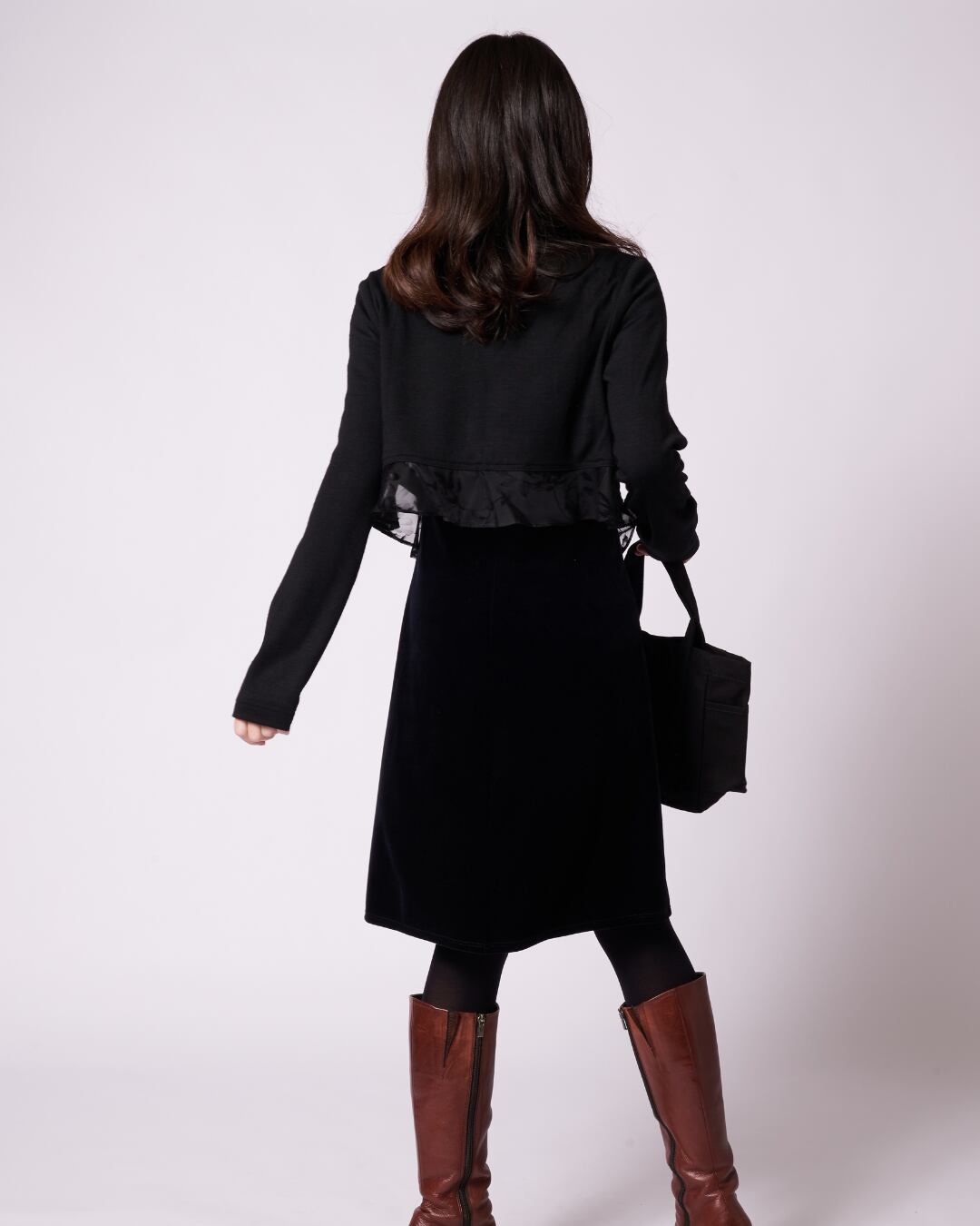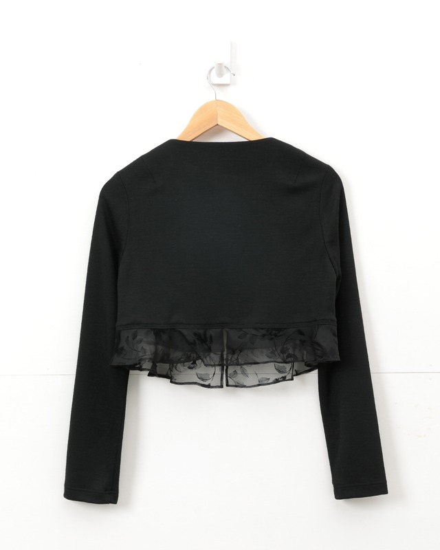 シンプルな黒のウール生地に、繊細な花柄のオーガンジーを使用した可愛らしいデザイン。