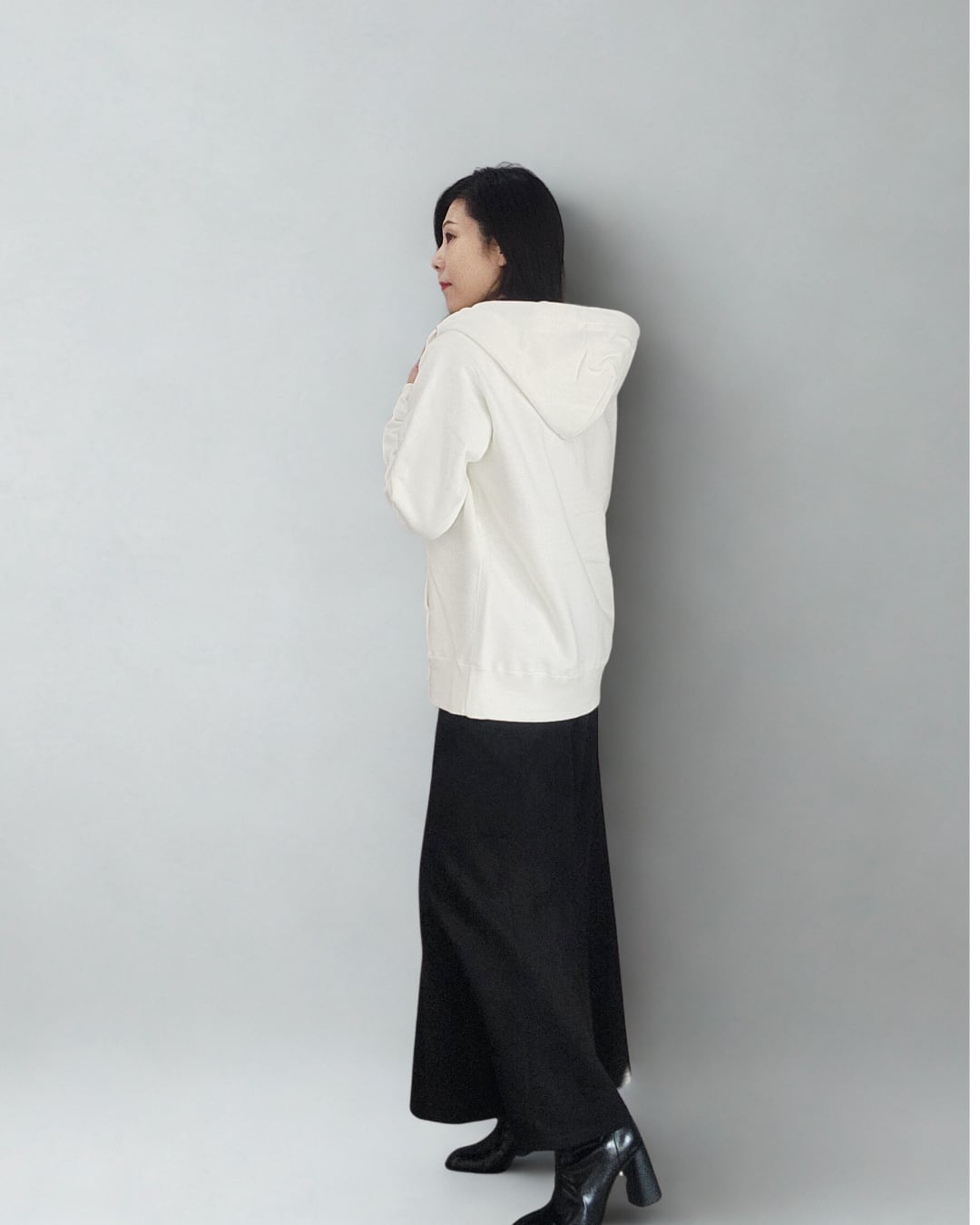 柔らかいオフホワイトが、表情を明るく見せてくれるジップアップパーカー。