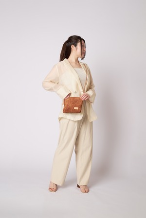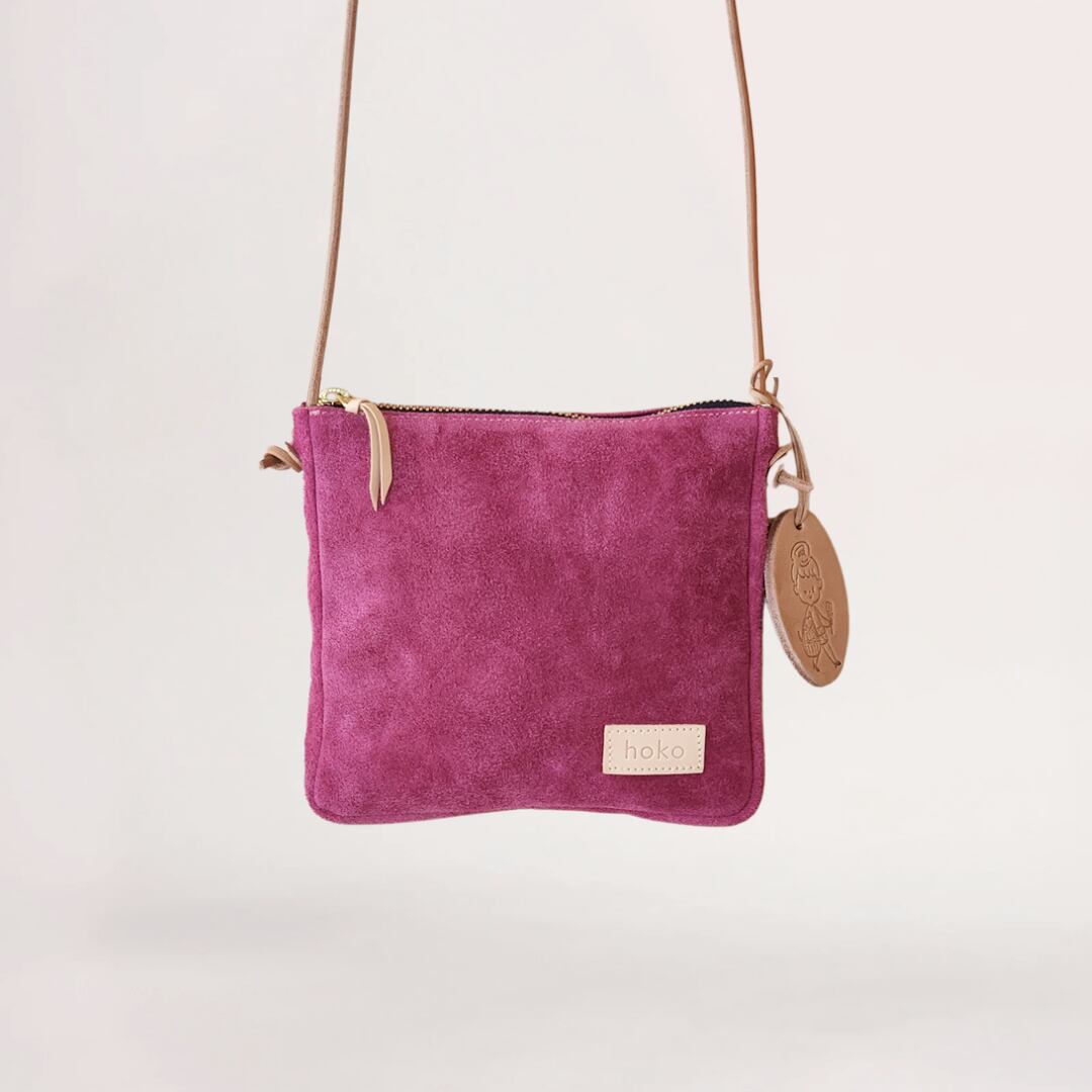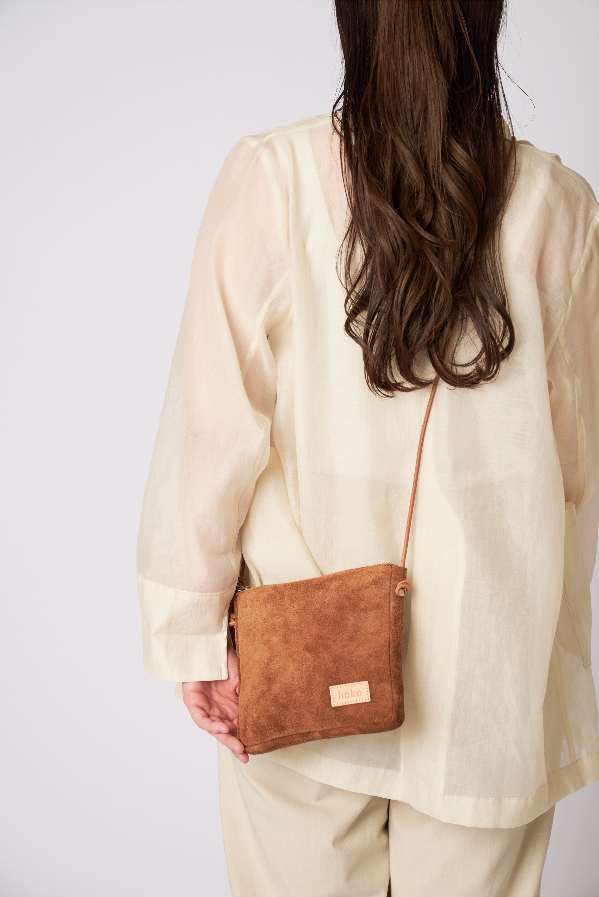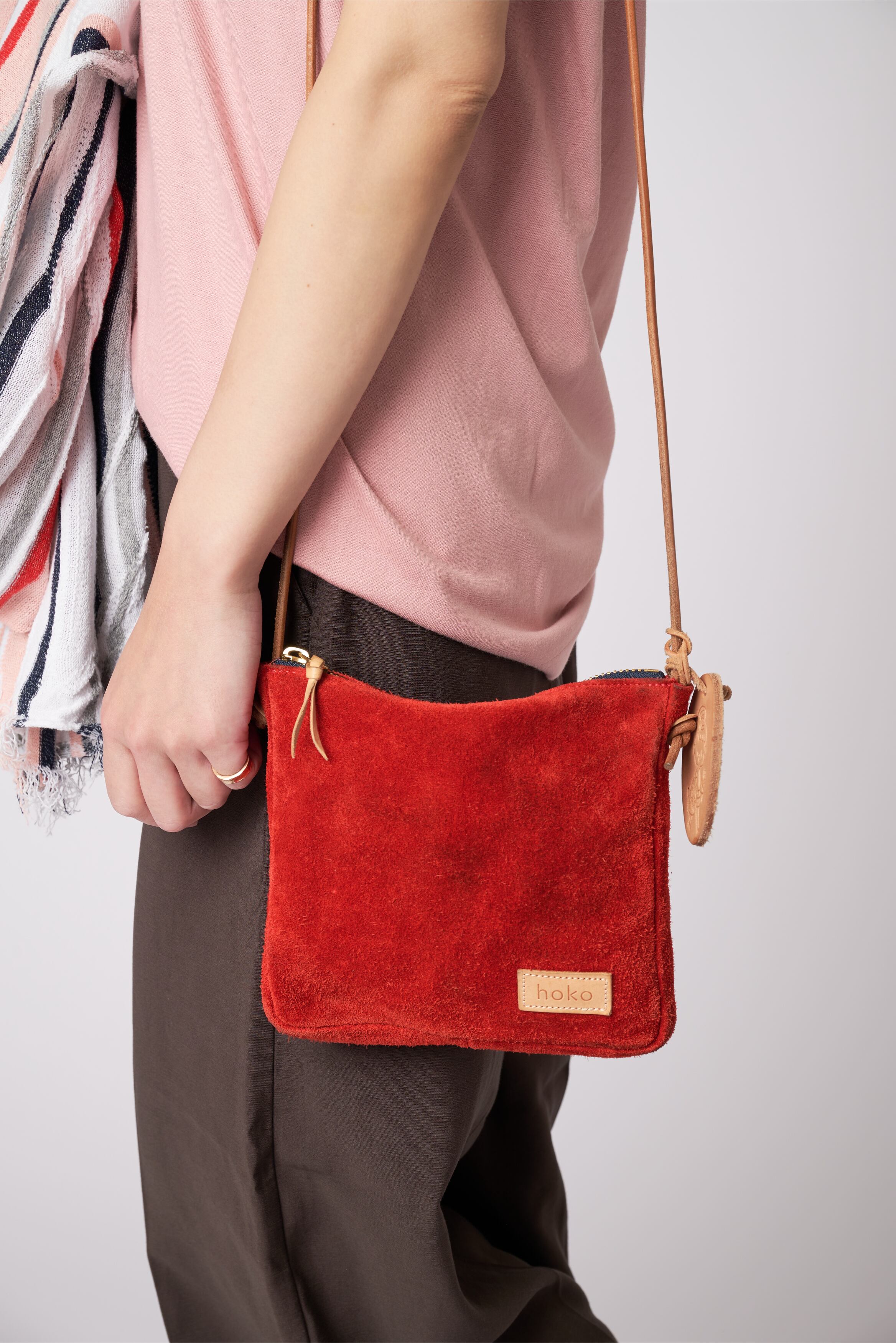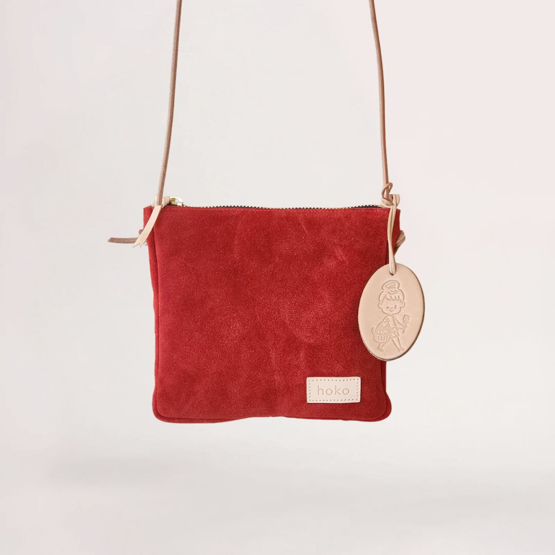 国産ベロア革を使用した、コンパクトサイズのポシェット。ご自身で結び目の位置を変える事で簡単に長さの調整が可能です。またショルダー革紐をハサミ等で切って短くご使用いただくことも可能。 柔らかいキップベロアという起毛した牛革で、発色が良く色も豊富な事もこの素材のポイント。財布、スマホ、キーケース入れて丁度程度の収納量です。ちょっとしたお出かけに斜めがけとして、また普段お使いのバッグに忍ばせバッグインバッグとしてなど、その時のファッションや生活スタイルに合わせてご使用いただけます。